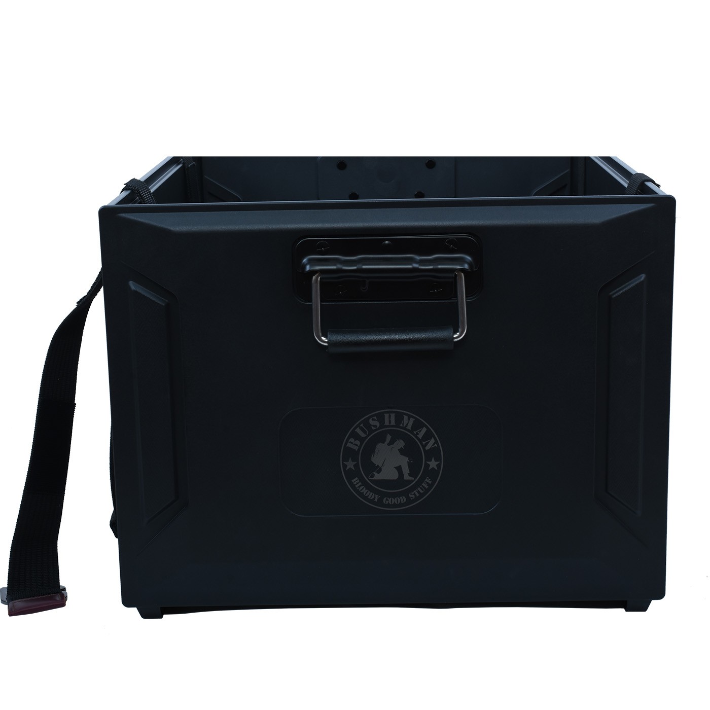 Dank der Schnallen und verstellbaren Gurte lĂ€sst sich die Box zuverlĂ€ssig verschlieĂen, der Klettverschluss sorgt fĂŒr Sicherheit. An den Seiten befinden sich ausklappbare Metallgriffe, die den Transport erleichtern. Das dezente, lasergravierte BUSHMAN-Logo (und der Slogan „Bloody good stuff“) verleihen der Box Stil. Die Box hat ein Fassungsvermögen von 46 Litern, wiegt 5 kg und misst nach dem Zusammenbau (eine Anleitung liegt der Verpackung natĂŒrlich bei) 54 × 38 × 30 cm. Nach dem Zusammenbau empfehlen wir, die Box nicht wieder auseinanderzunehmen, um die StabilitĂ€t der Verbindungen zu gewĂ€hrleisten. Die Box kann gestapelt werden, aber bitte nicht darauf steigen – auch wenn sie sehr stabil ist, ist sie keine Leiter ;-).