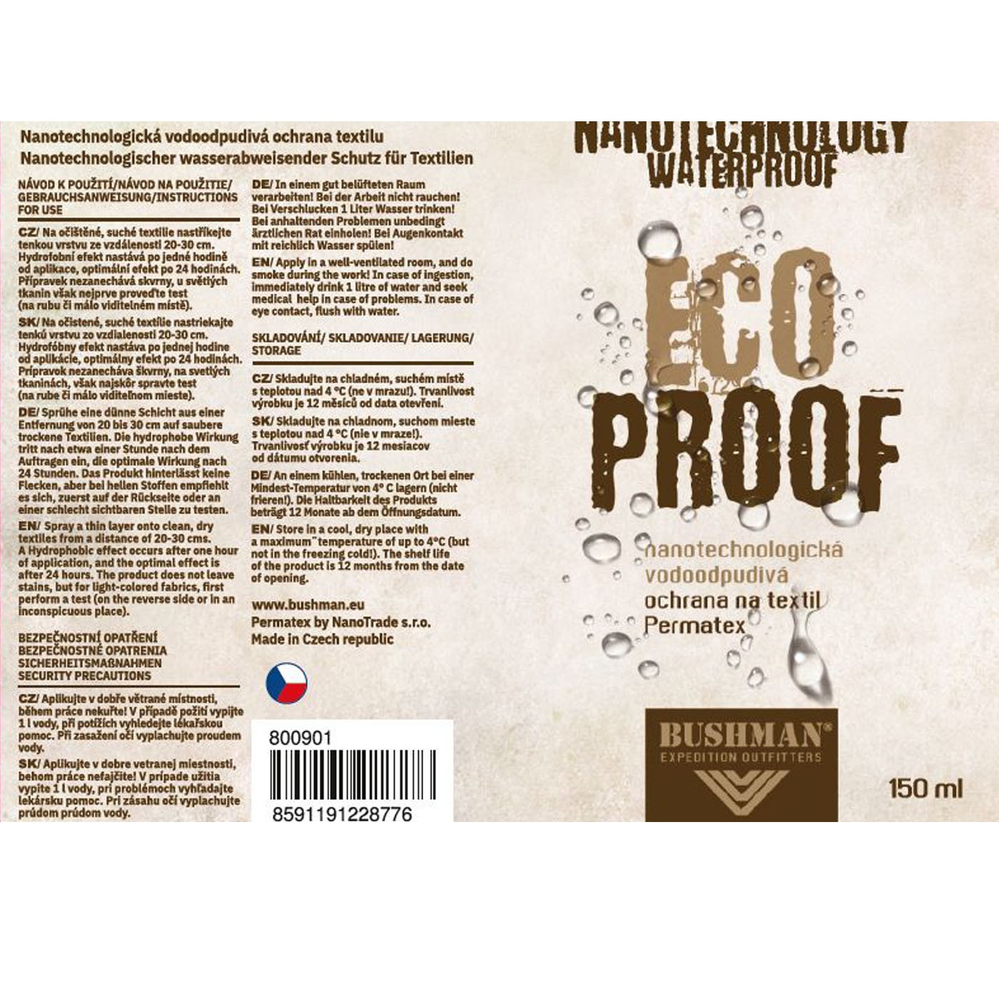 Die Imprägnierung BUSHMAN ECO PROOF ist ein nanotechnologischer wasserabweisender Schutz für Permatex-Textilien, der auch Bekleidung aus natürlichen Materialien vor Wasser schützt. Es hinterlässt keine Flecken und verändert auch nicht das Erscheinungsbild der Oberfläche. Wir empfehlen jedoch, leichte Stoffe auf einer kleinen Fläche auf der Rückseite oder an einer Stelle zu testen, die nicht direkt sichtbar ist.