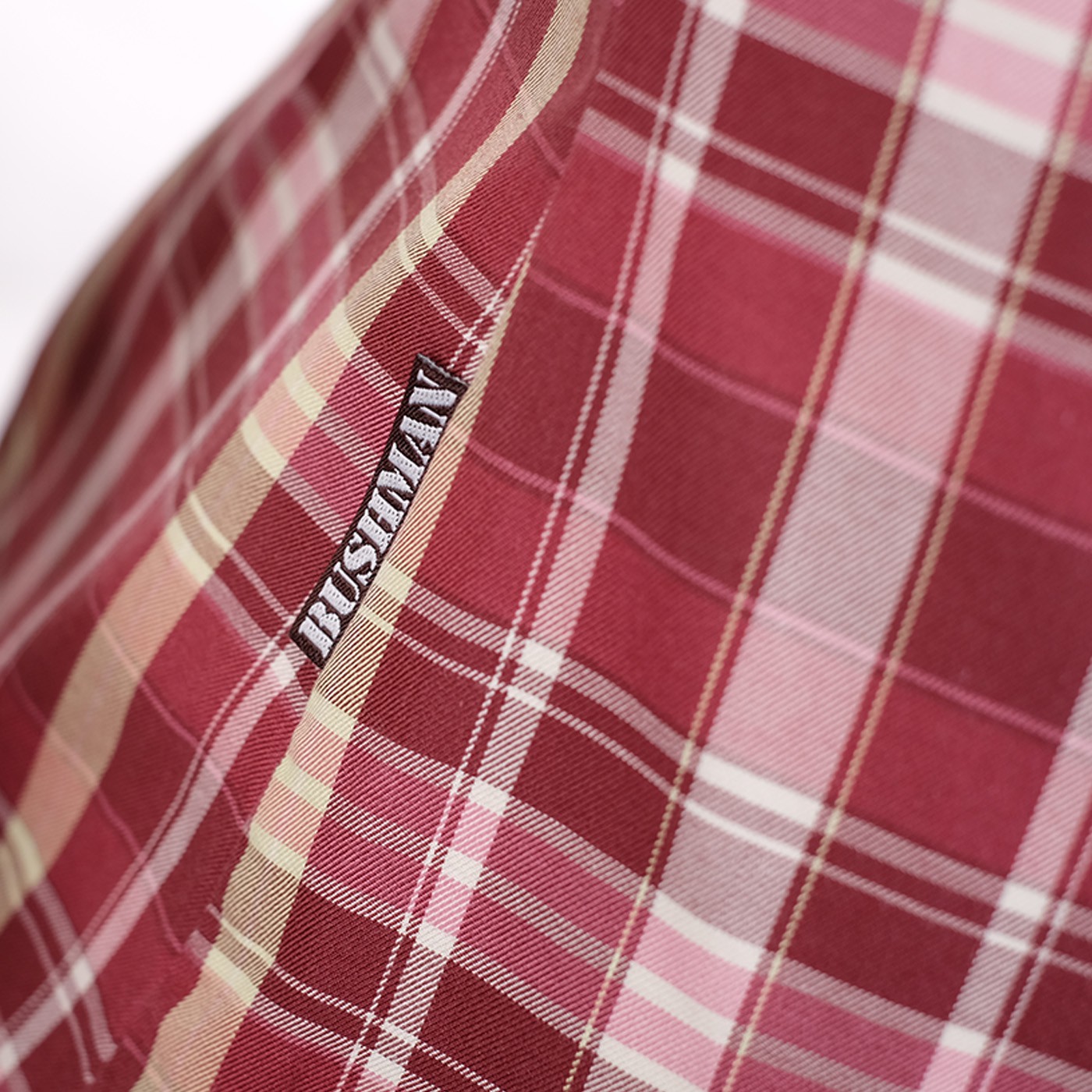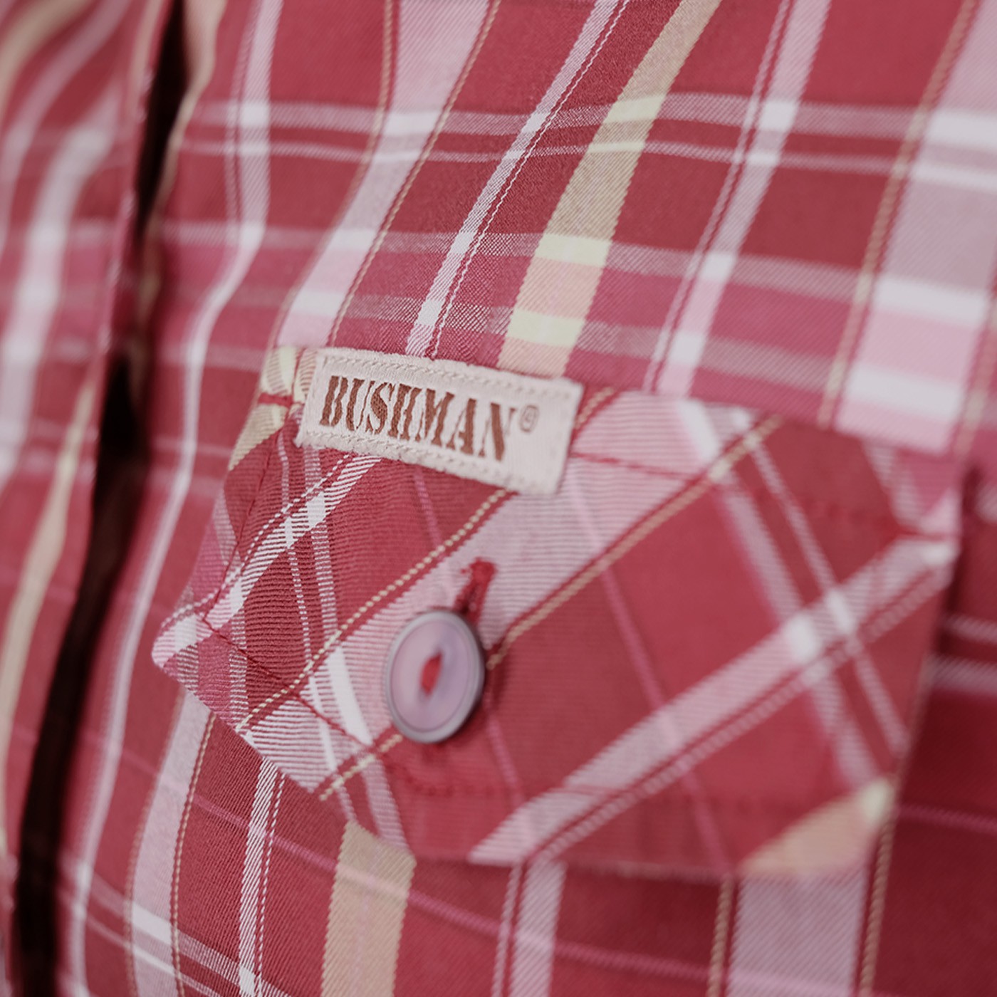 Zu den Design-Elementen gehören das BUSHMAN-Flaglabel in der Seitennaht sowie ein Aufnäher mit dem BUSHMAN-Loge auf der linken Brusttasche. Die Kontrast-Manschetten mit Aufdruck beim Hochkrempeln der Ärmel sind ein Blickfang.