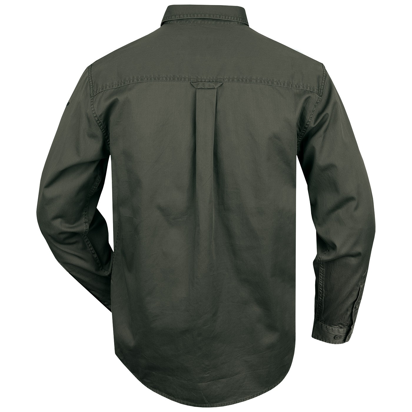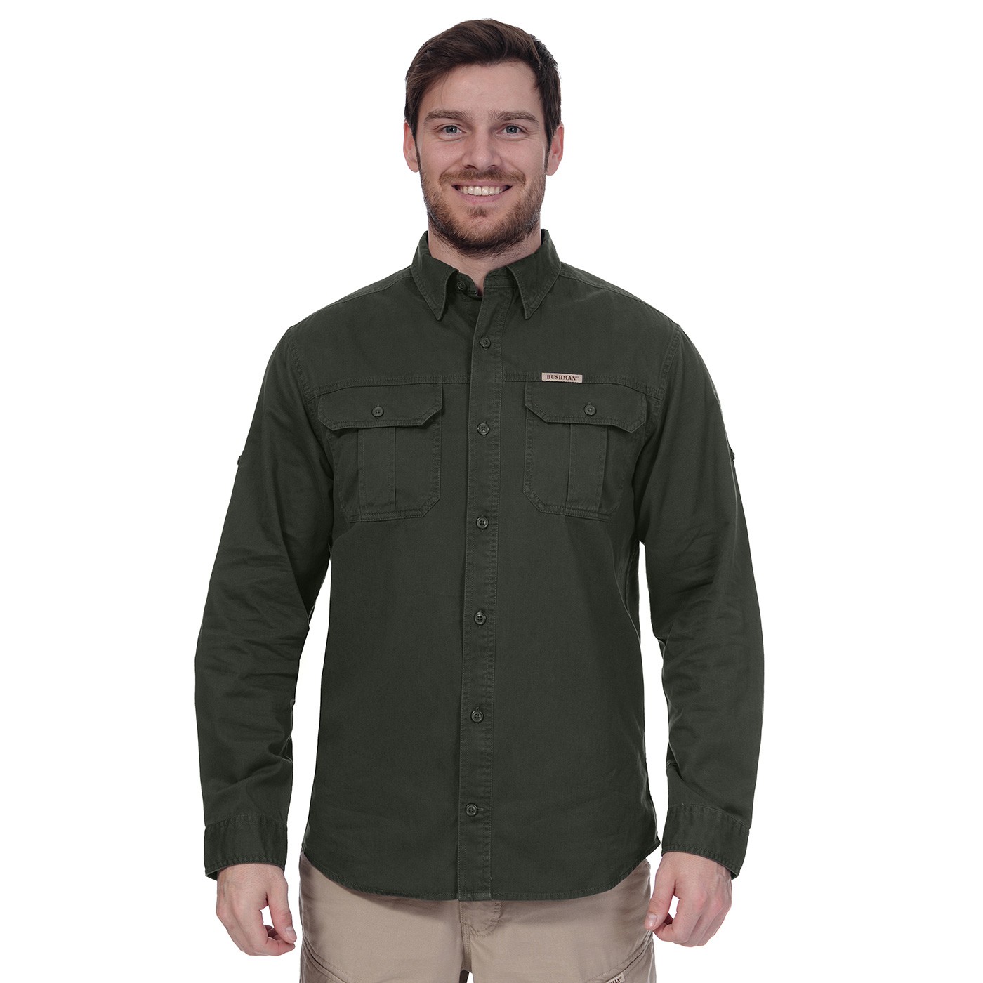 Knallhartes Hemd für knallharte Männer für (nicht nur) knallharte Reisen. Das Expeditionshemd BUSHMAN DRYDEN wurde aus hochwertigem hundertprozentig natürlichem Material mit verstärkter Struktur genäht und durch leichtes abschleifen weicher gemacht. Bei der finalen Behandlung wird das Hemd zudem noch enzymatisch vorgewaschen, dadurch wird es noch weicher und geschmeidiger und außerdem wird bei dieser Behandlung auf den Nähten die charakteristische Patina gebildet. Der Tragekomfort wird durch die Dehnungsfalten am Rücken, mit deren Hilfe der Stoff auch bei heftigen Bewegungen nicht zieht, sowie durch die Bänder für die Befestigung hochgekrempelter Ärmel gesteigert. Weitere funktionelle und ästhetische Elemente sind die Faltentaschen, in denen man mehr als in klassischen Brusttaschen unterbringen kann, die versteckten Knöpfe für die Befestigung der Kragenspitzen, der Aufhänger am Rücken und die mit Doppelnadel ausgeführte Nähte, die das Hemd fester machen und zudem gut aussehen. Das Symbol der Marke BUSHMAN finden Sie eingenäht im linken Ärmel, das unauffällige Logo auf dem Flaglabel und auf dem Aufnäher oberhalb der linken Brusttasche.