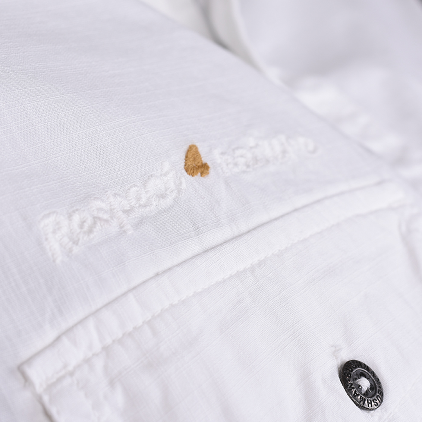 100% Baumwolle, Kontraststickereien oberhalb der Taschen, Metallknöpfe