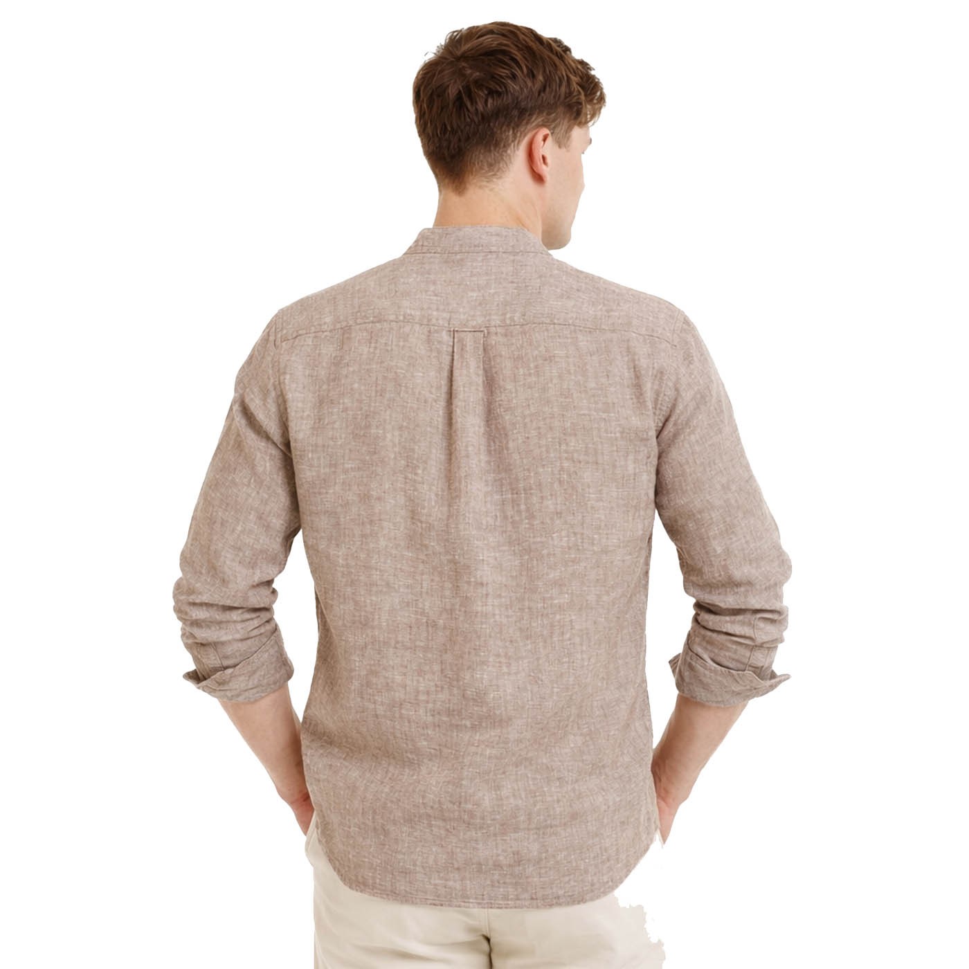 Das Hemd SITAN ist aus 100 % Leinen in einem leichten Y/D-Chambray-Finish mit feiner Melange-Optik gefertigt. Es hat lange Ärmel, einen kragenlosen Stehkragen, einen lockeren Schnitt und praktische Falten im Rücken für optimale Bewegungsfreiheit. Zwei Brusttaschen mit Knopfklappen runden das Design ab. Klassische Manschetten, ein abgerundeter Saum und ein Markenlogo in der Seitennaht vervollständigen den funktionalen und natürlichen Look.
