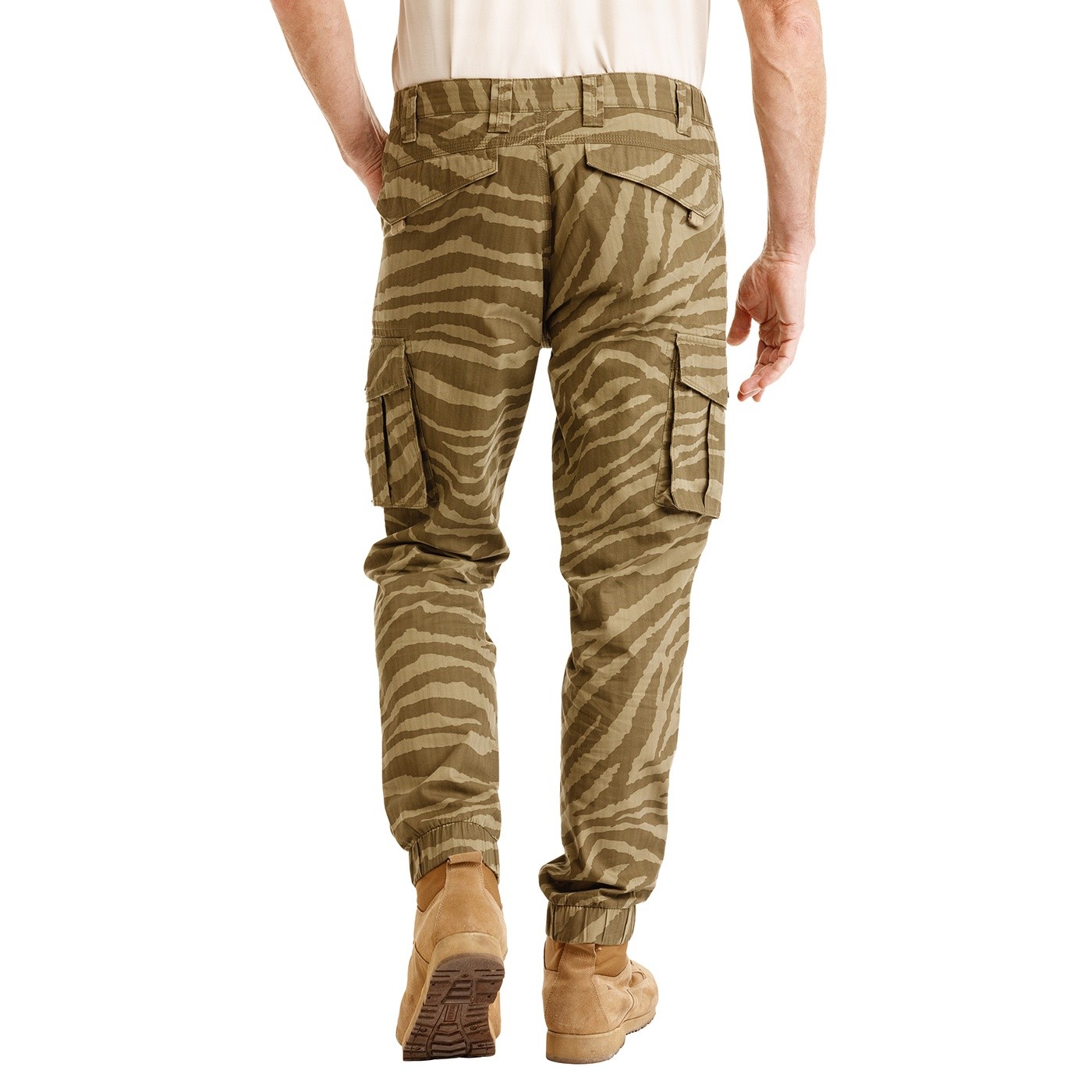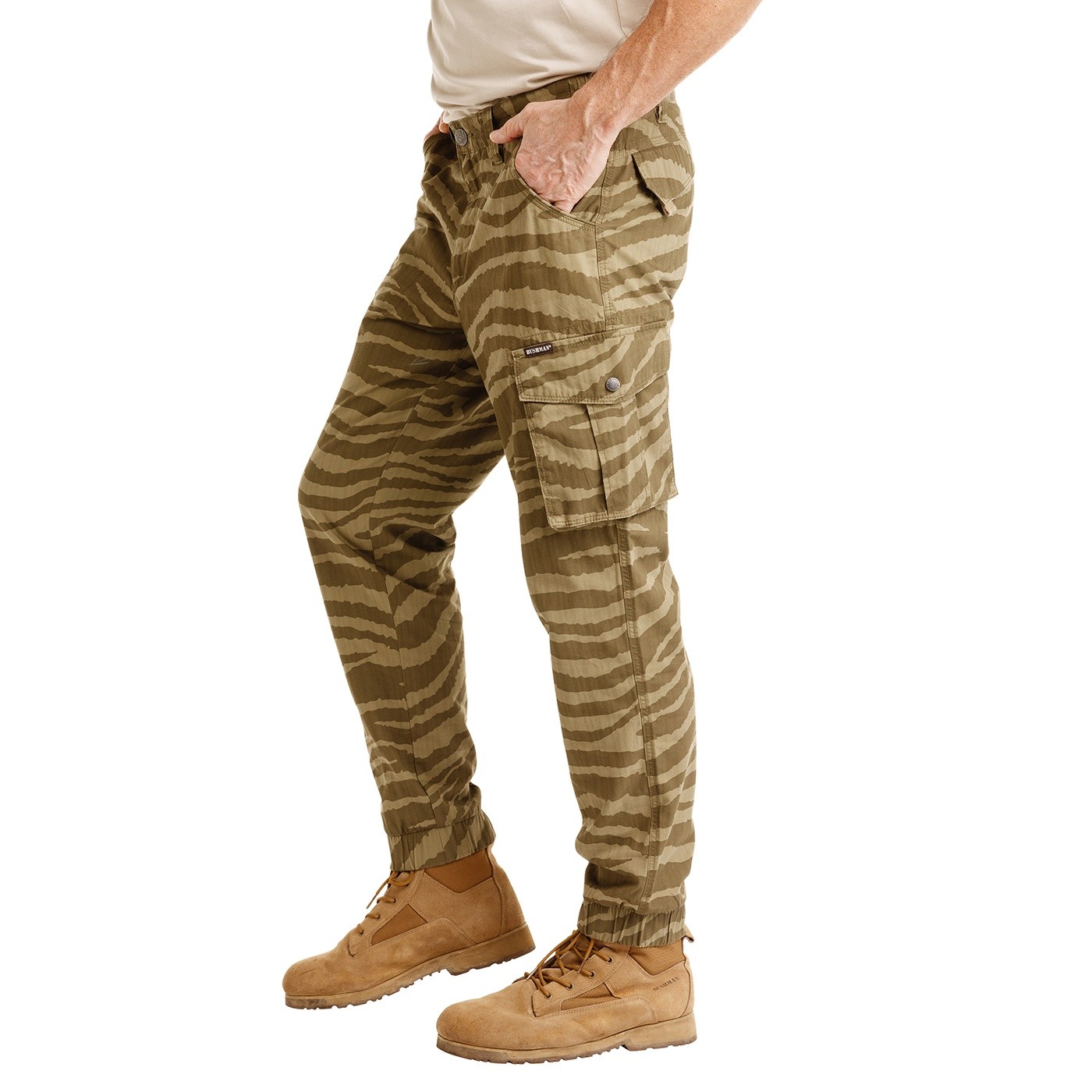 Diese Hose mit Rippstrick-Taschen vereint Strapazierfähigkeit und Stil. Die Köperbindung sorgt für zusätzliche Festigkeit, während die elastischen Bündchen an den Knöcheln für bequeme Bewegungsfreiheit sorgen. Praktische Taschen bieten viel Platz für alles, was man braucht. Das markante Camouflage-Muster verleiht dem Outfit einen authentischen BUSHMAN-Touch. Ideal für die Stadt, Outdoor-Aktivitäten und die Freizeit.