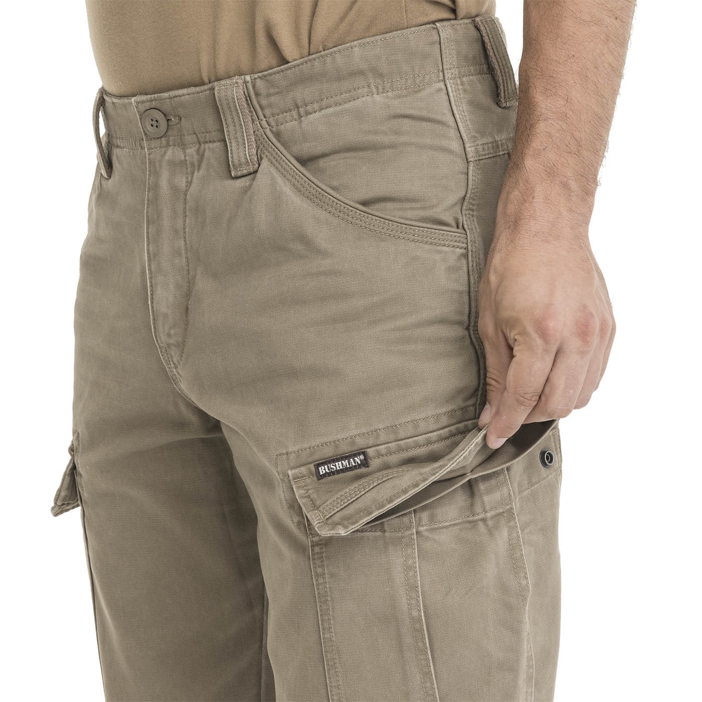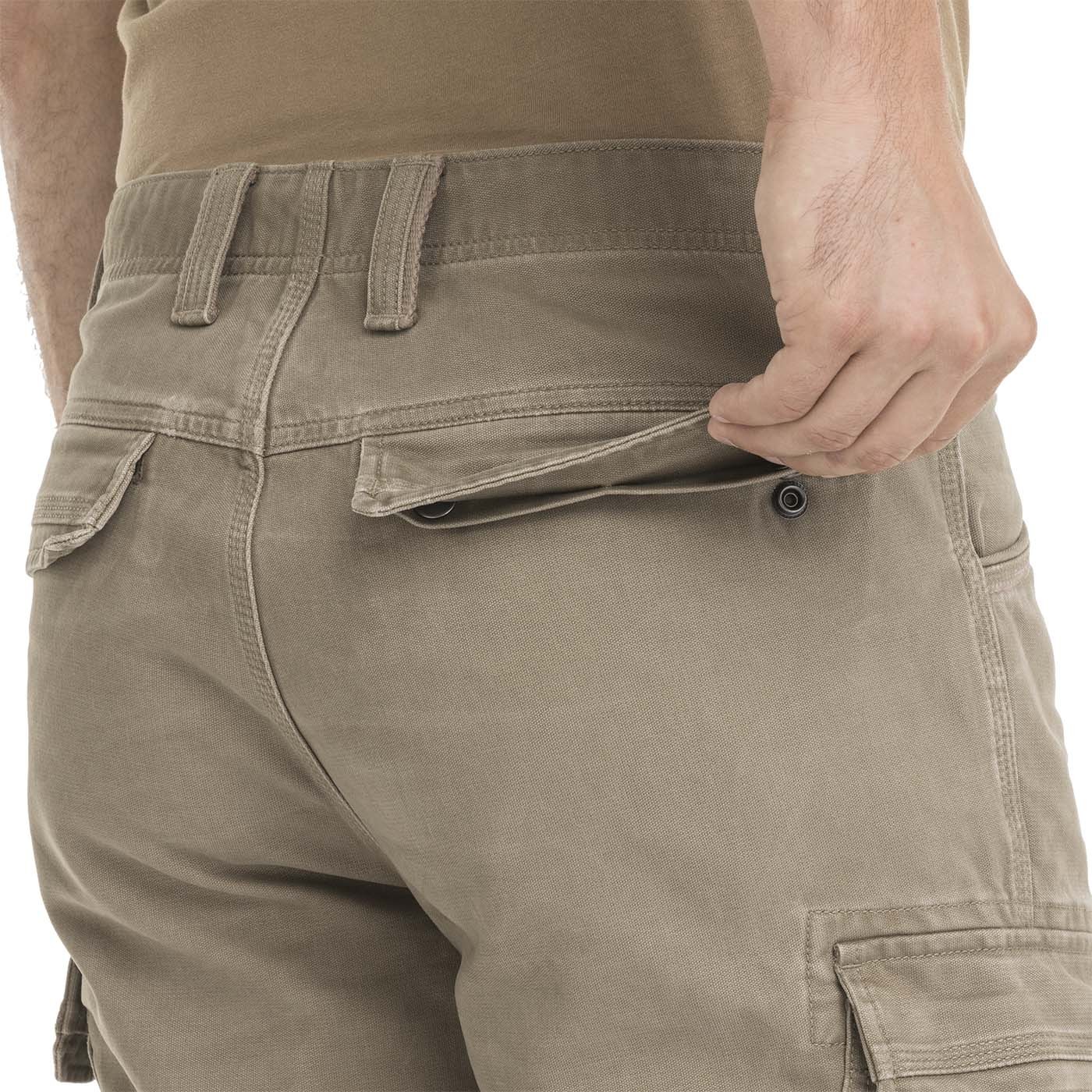 Die Cargohosen sind aus robustem Baumwollstoff mit hohem Stoffgewicht gefertigt, haben eine gebürstete Oberfläche und wurden einer weichmachenden Waschung unterzogen, sodass du vom ersten Moment an besten Tragekomfort genießt. Die großzügigen aufgesetzten Taschen mit verdeckten Druckknöpfen (zusammen mit den Gesäßtaschen, ebenfalls mit Druckknöpfen) bieten zuverlässig Platz für alles, was du ständig griffbereit haben musst. Innen findest du zudem ein kleines Münzfach – denn jeder Abenteurer muss auch mal bar bezahlen. Ein dezentes Detail erwartet dich innen am Bund – ein Markenprint.