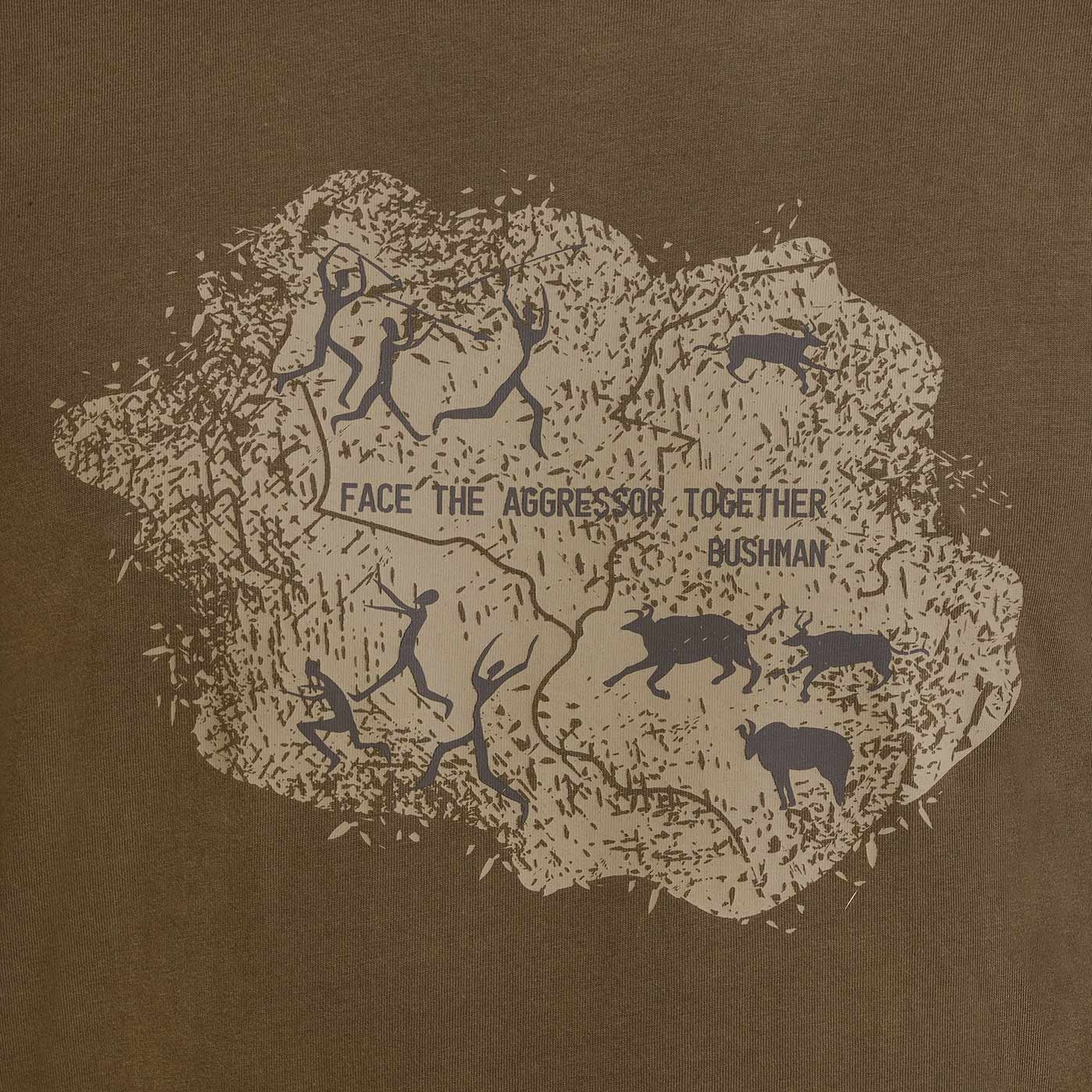 Der Druck „Gemeinsam der Aggression begegnen“ ist von traditionellen Höhlenmalereien inspiriert und besticht durch klare Linien, ausdrucksstarke Direktheit und eine starke Botschaft. Herausforderungen gemeinsam meistern, nicht ausweichen und Kurs halten. Diesen Gedanken vertritt BUSHMAN seit seiner GrĂĽndung.