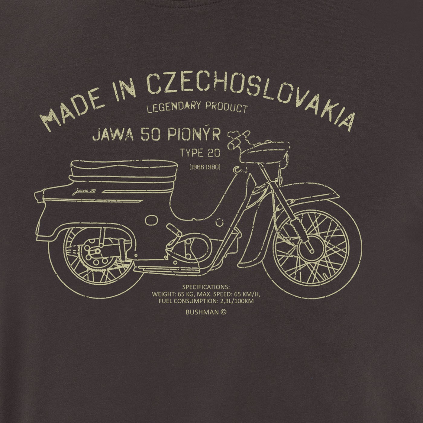 Wir schätzen Dinge, die die Welt oder die Herzen vergangener Generationen erobert haben. Zum Beispiel den „Fichtl“ oder „Pincek“, Typ 20 mit Revmaplechen oder 21 Sport. Auf diesem Motorrad, das in den Považské strojírny-Werken hergestellt wurde, sind viele Generationen aufgewachsen. Das Motorrad, Mitte des 20. Jahrhunderts als erschwingliches Transportmittel für breite Bevölkerungsschichten entwickelt, war und ist bis heute die ideale Maschine, um das Prinzip des Zweitaktmotors zu verstehen und Geduld zu trainieren. Mit einer speziellen Edition von Drucken auf diesen Baumwoll-T-Shirts mit kurzen Ärmeln zollt BUSHMAN den legendären Produkten „made in Czechoslovakia“ Tribut. 100 % Baumwolle, Stoffgewicht 180 g/m², gerader Schnitt.