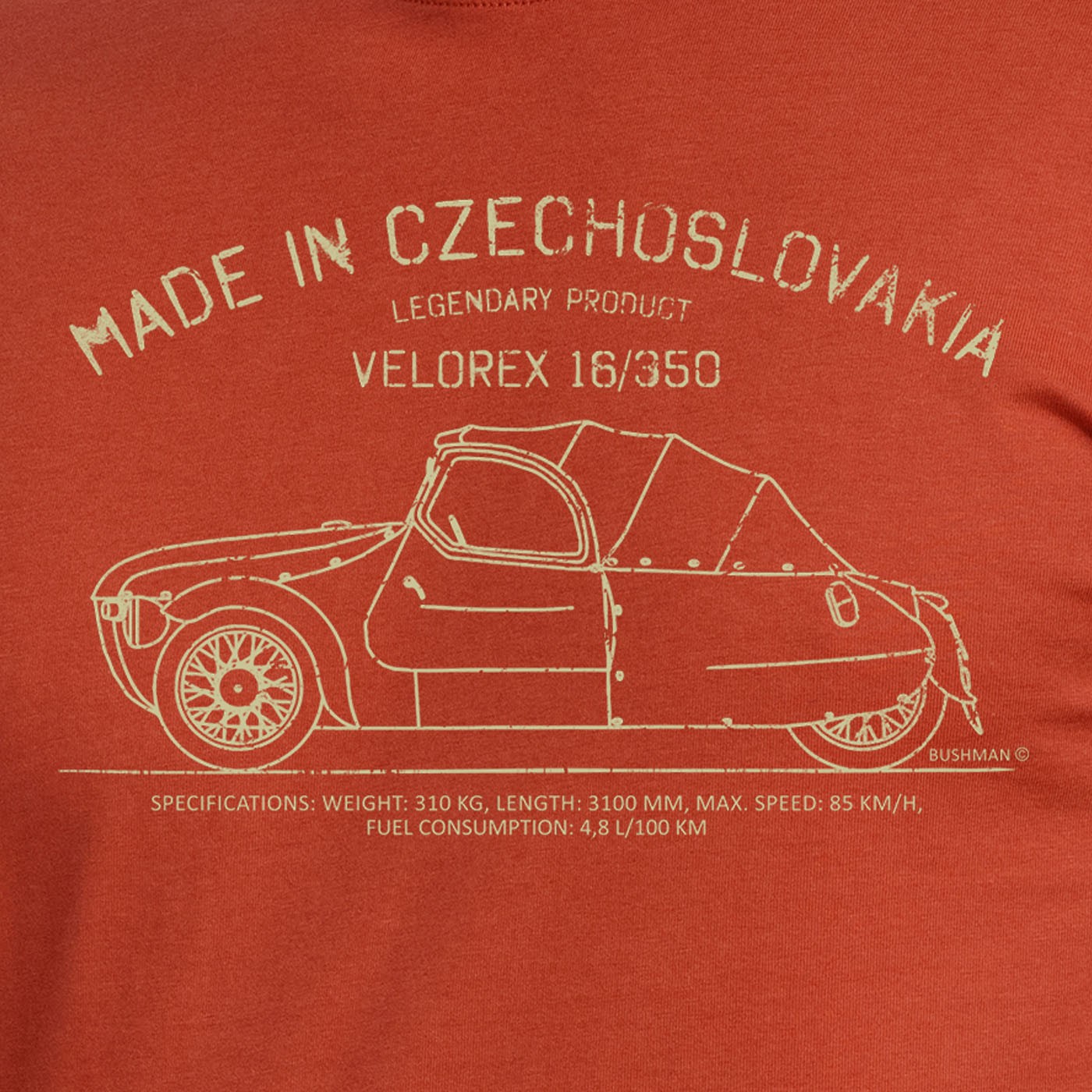 Wir schätzen Dinge, die die Welt oder die Herzen vergangener Generationen erobert haben. Der Velorex, liebevoll „Hadrák“, „Hadraplán“, „Gänsekeule“, „Montgomerák“, „Fledermaus“, „verrĂĽckte Rohre“ oder „fliehendes Zelt“ genannt, wurde zum einzigen weltweit zugelassenen Fahrzeug mit Stoffkarosserie. Der ursprĂĽnglich in Kleinserie produzierte Rohrrahmen, ĂĽberzogen mit Kunstleder, war eine Konstruktion der BrĂĽder František und MojmĂr StránskĂ˝. Gefertigt wurde er in der Genossenschaft VelodruĹľstvo Solnice als Fahrzeug fĂĽr Menschen mit Behinderung und wurde später durch den Film VrchnĂ, prchni! berĂĽhmt. Mit einer speziellen Edition von Drucken auf diesen Baumwoll-T-Shirts mit kurzen Ă„rmeln zollt BUSHMAN den legendären Produkten „made in Czechoslovakia“ Tribut. 100 % Baumwolle, Stoffgewicht 180 g/m², gerader Schnitt.