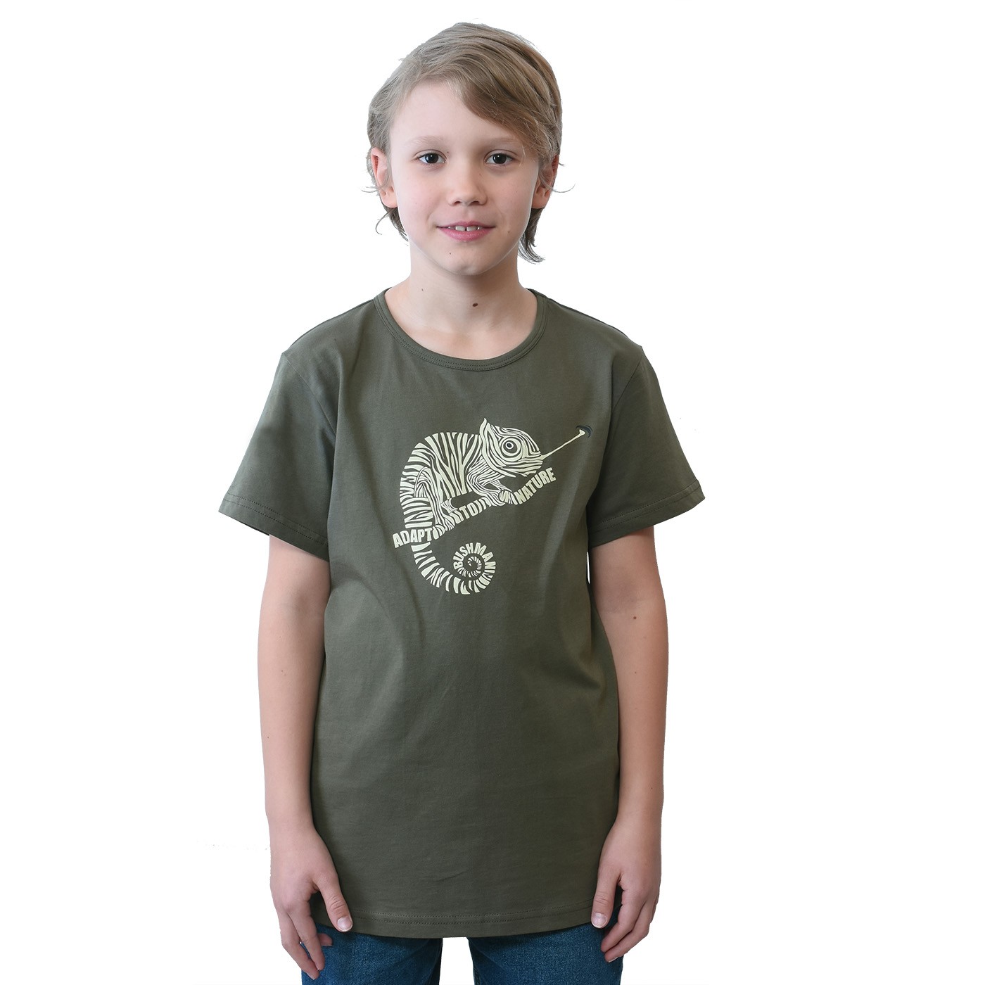 Anpassen an die Natur? Mit einem Chamäleon auf der Vorder- und Rückseite fällt es spielerisch leicht! Das kurzärmelige Kinder-Baumwoll-T-Shirt MONTY mit dem originellem Animal-Print ist für echte junge Abenteurer.