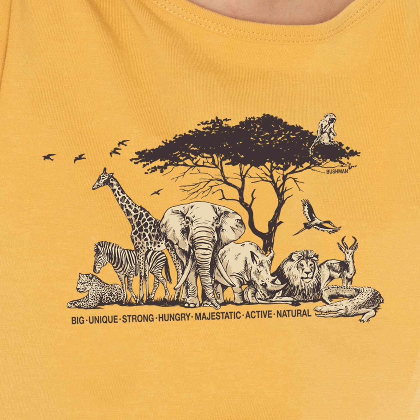 Kennt ihr schon alle afrikanischen Tiere? Bringe deinem kleinen Buschmann die berühmtesten bei, sie sind auf dem gelben T-Shirt MONTY aufgedruckt. Dieses Kinder-T-Shirt mit kurzen Ärmeln haben wir aus angenehmer 100% Baumwolle genäht, es hat einen klassischen Schnitt und trägt einen Aufdruck, dem kein kleiner Buschmann widerstehen kann.