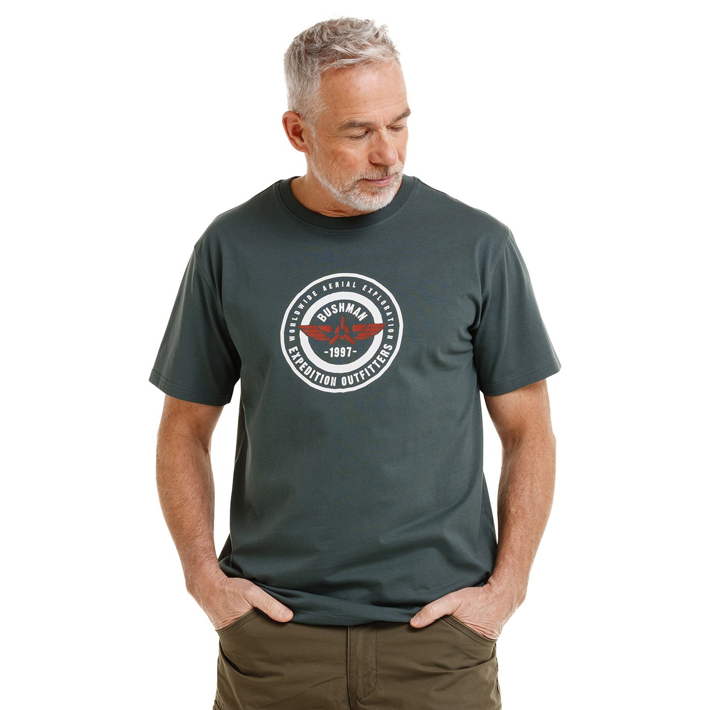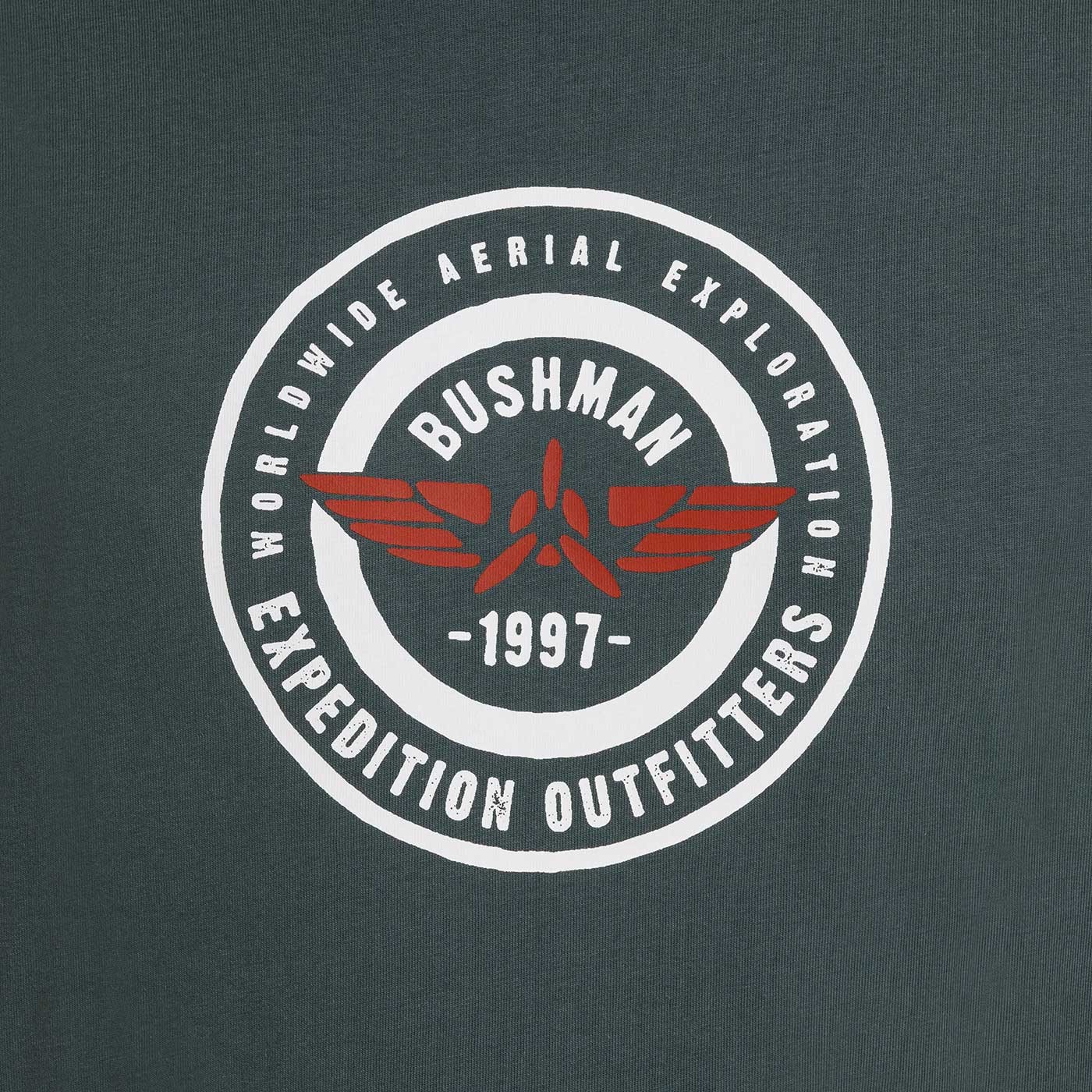 „Expedition Outfitters – Weltweite Lufterkundungen“ – Der runde Aufdruck mit Flugzeugsymbol verweist auf das Lufterkundungsprogramm und symbolisiert den Wunsch, die Welt aus einer neuen Perspektive zu entdecken. Das Motiv vereint Expeditionen, Reisen und die abenteuerlichen Ursprünge des BUSHMAN-Slogans.