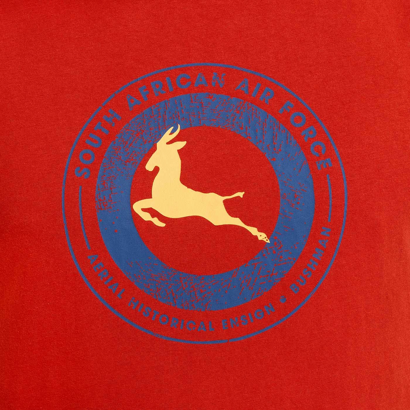 „Südafrikanische Luftwaffe“ – Das Motiv basiert auf der ursprünglichen Bezeichnung der Flugzeuge der südafrikanischen Luftwaffe: ein springender goldener Springbock (eine Antilope, das Nationalsymbol Südafrikas) in einem blauen Kreis. Der Druck verweist auf die Geschichte der südafrikanischen Luftfahrt und symbolisiert Geschwindigkeit, Bewegung und Freiheit.