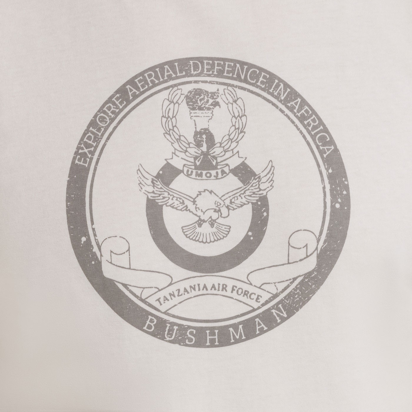 „Luftverteidigung in Afrika entdecken“ – Ein Luftmotiv, inspiriert von der Bezeichnung der Flugzeuge der tansanischen Luftwaffe. Das Emblem im Kreis ergänzt den äußeren Text mit der freien Bedeutung „Mehr über die Luftverteidigung Afrikas erfahren“ und verleiht dem Druck so seinen originellen Charakter.