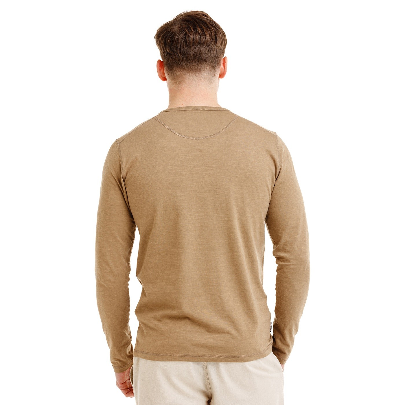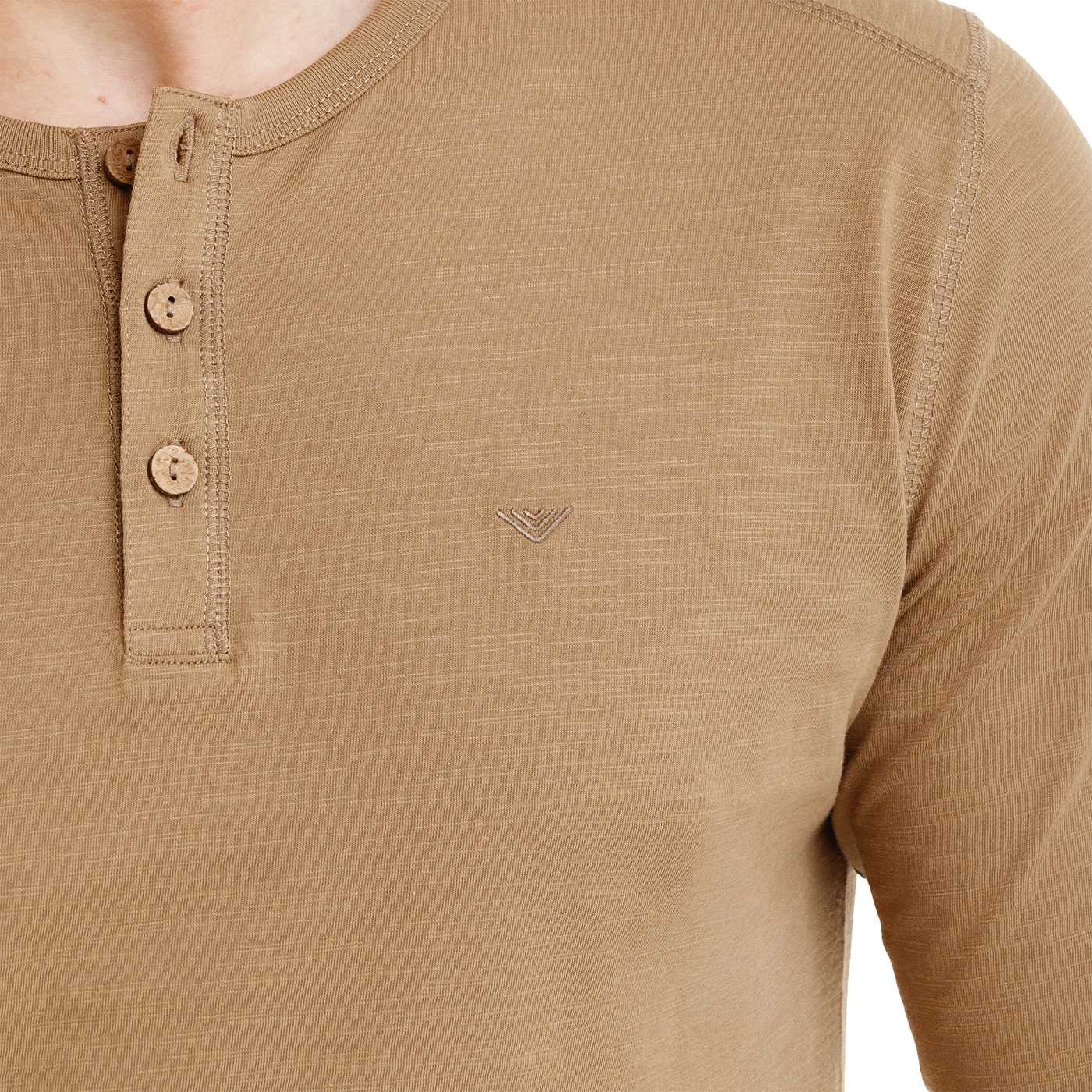 Unser Henley T-Shirt NAKAR für Herren besteht aus 100 % Baumwolle (leichtes Strickgewebe mit natürlicher unregelmäßiger Struktur – Slub Jersey). Es hat lange Ärmel, einen klassischen Rundhalsausschnitt mit Kokosnussknopfverschluss und eine gerade, schmalere Passform. Der Nackenbereich ist mit einer Markenspitze verziert. Dekorative Ton-in-Ton-Nähte und eine feine Markenstickerei auf der Brust runden das Design ab.