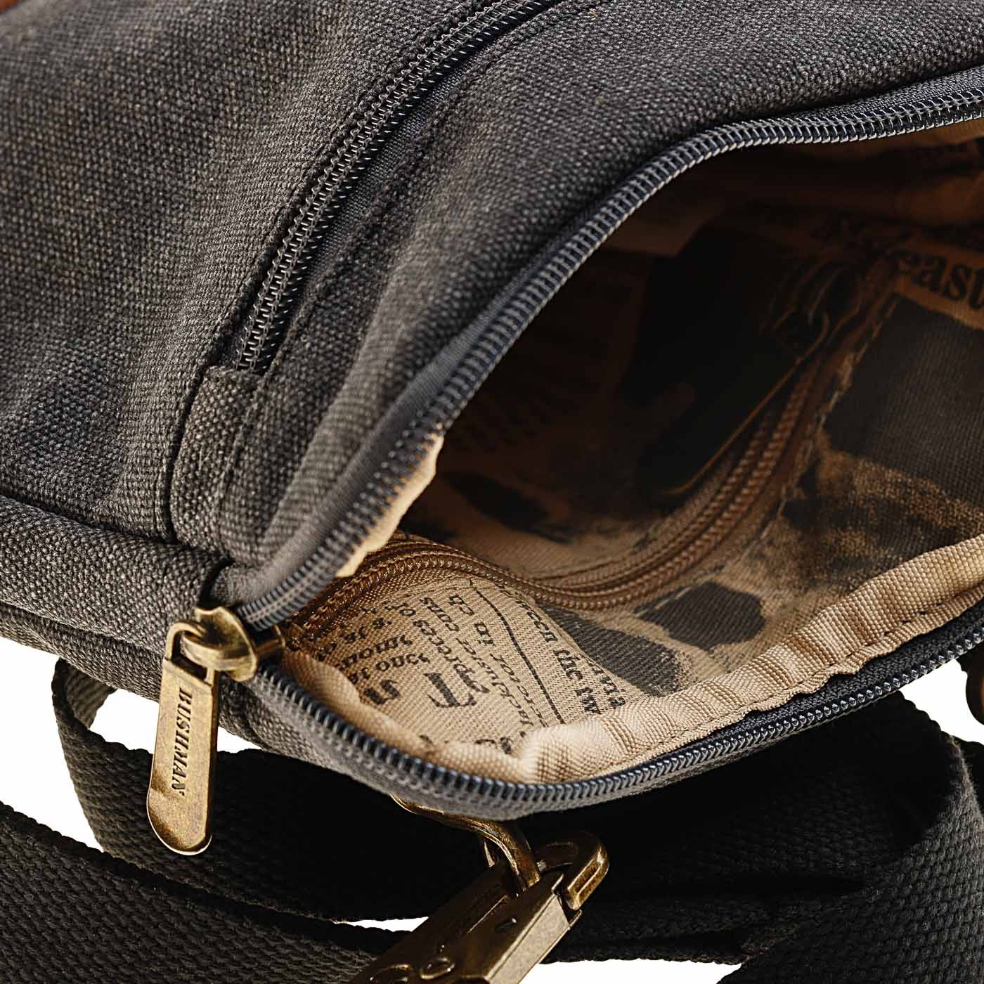 Die Tasche ist aus 100 % Baumwolle (Naturfaser) gefertigt, einem sehr robusten und langlebigen Material mit Echtlederdetails und einem abnehmbaren Gurt zum Tragen über der Schulter oder um die Hüfte. Sie verfügt über mehrere praktische Fächer
